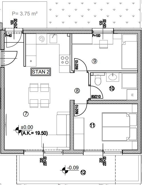 Sastoji se od dvije spavaće sobe, kupaonice, predsoblja, kuhinje s blagovaonicom i dnevnim boravkom i terase na tlu.