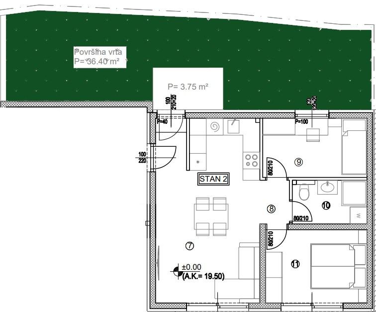 Ima 56 m2, od kojih je 46 m2 zatvoreni prostor a 9 m2 čini terasa na tlu. Stan ima dvorište/vrt na sjevernoj strani od 36 m2 koje pruža pregršt mogućnosti uređenja i iskoristivosti.