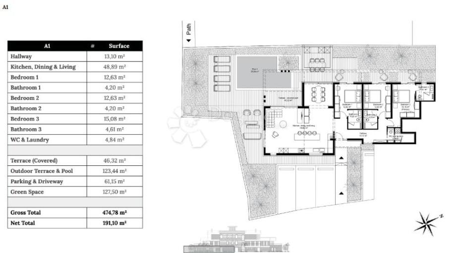 Neto površina rezidencije iznosi 191,10 m², a ukupna bruto površina s pripadajućim vanjskim prostorima i sadržajima 474,78 m². Zgrada je završena i ubrzo spremna za useljenje, a interijer obiluje pažljivo odabranim dizajnerskim namještajem – svaki komad stoji na svom mjestu, kao dio zaokružene cjeline.