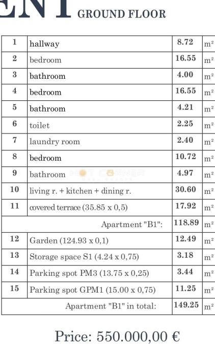Stan od 100 m² s velikom natkrivenom terasom i privatnim vrtom od 124,93 m² pruža osjećaj kuće u okviru moderne rezidencije – savršeno za opuštanje, druženja i obiteljski život.