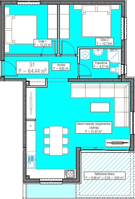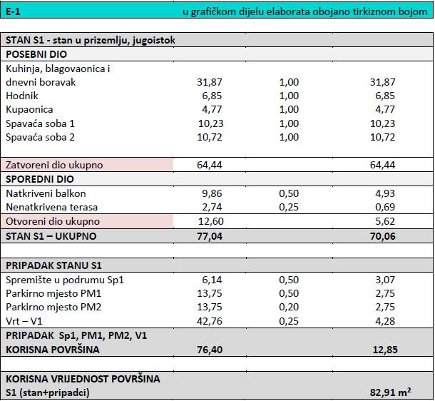 Stan oznake S1 smješten je u prizemlju novogradnje s ukupno 8 stambenih jedinica, ukupne netto površine 82.91 kvadratnih metara. Stan se sastoji od hodnika, kuhinje s blagovaonicom i dnevnim boravkom, kupaonice, 2 spavaće sobe, natkrivenog balkona i terase sveukupne površine 12.6 m2. Iz dnevnog boravka omogućen je izlaz u vlastiti vrt površine 42.76 kvadratnih metara – idealan za uživanje na otvorenom. Stan ima pogled na more.