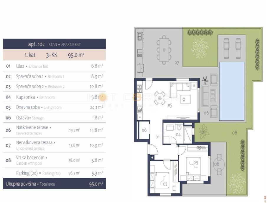stanovi u prizemlju imati u vlasništvu pripadajući vrt, te vanjski bazen.