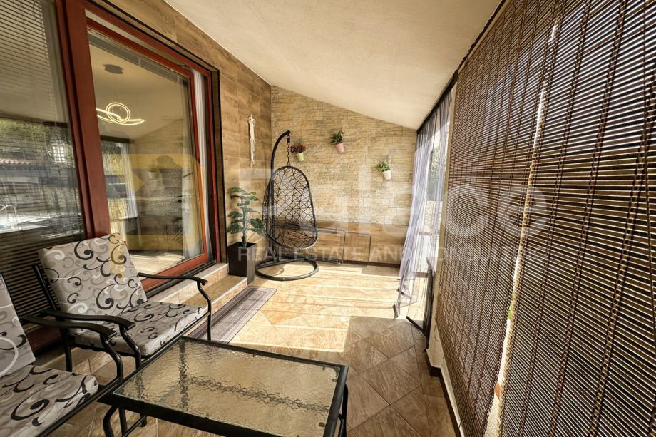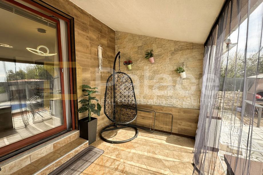 - Izlaz kroz staklenu stijenu na natkrivenu terasu i dvorište s bazenom