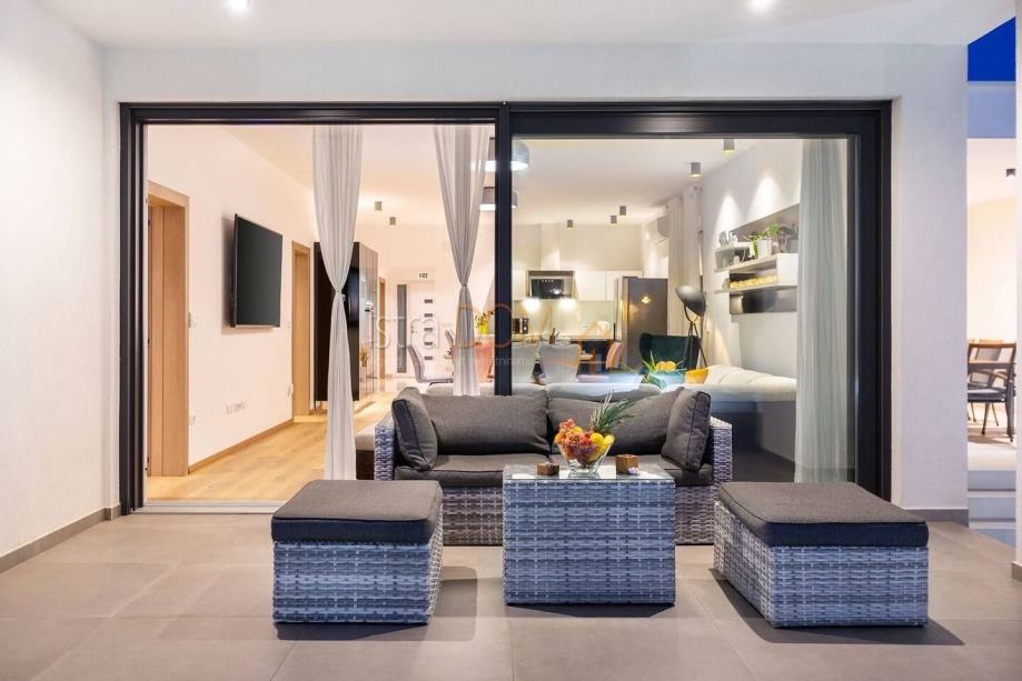 Iz dnevnog boravka izlazi se na vanjsku natkrivenu terasu opremljenu sjedećom garniturom, savršenom za uživanje u ljetnim večerima.