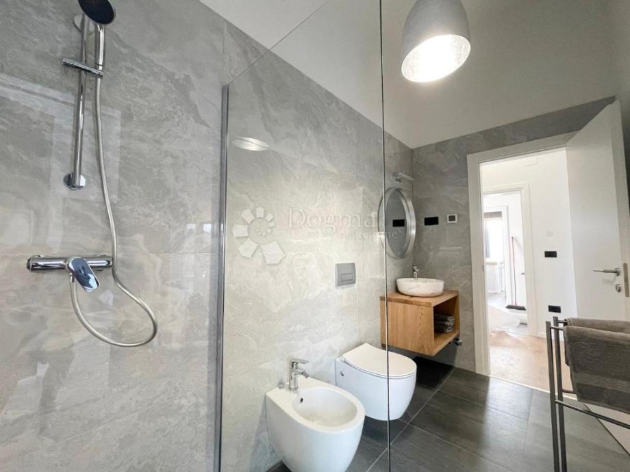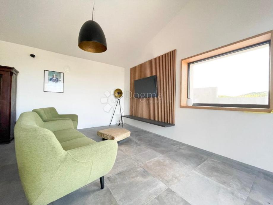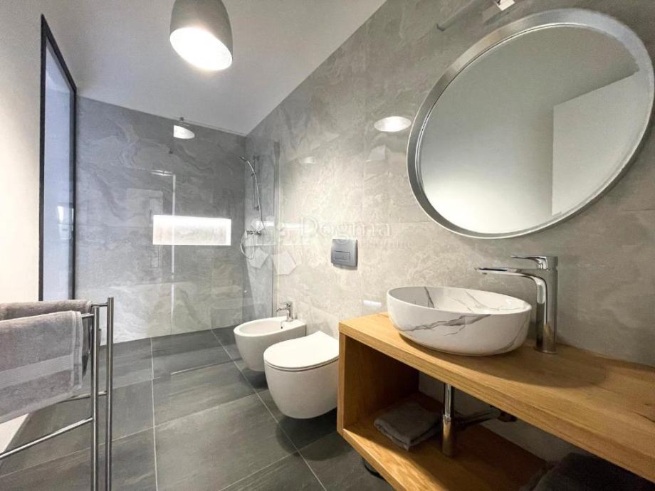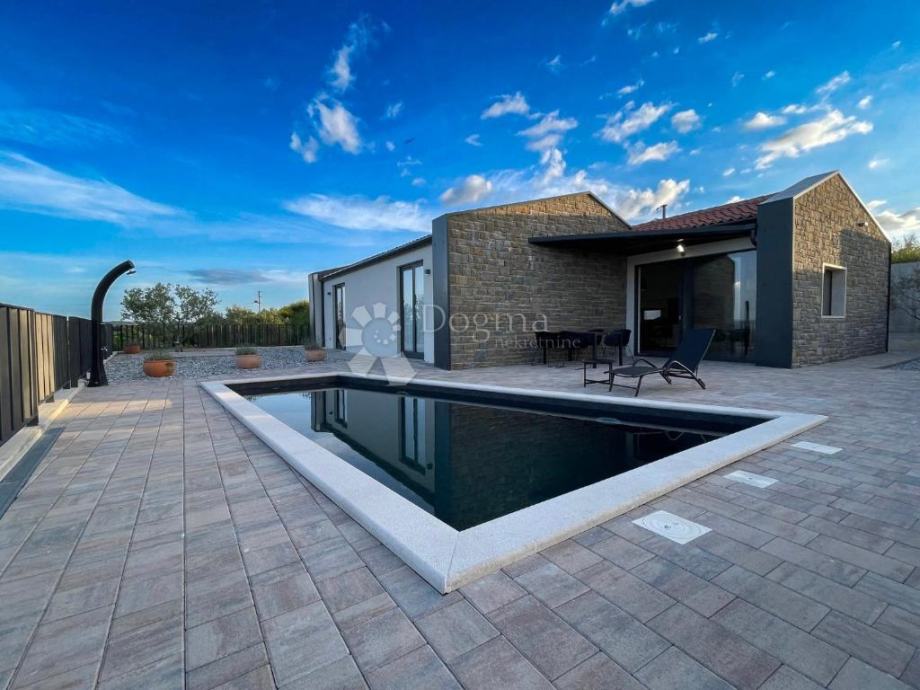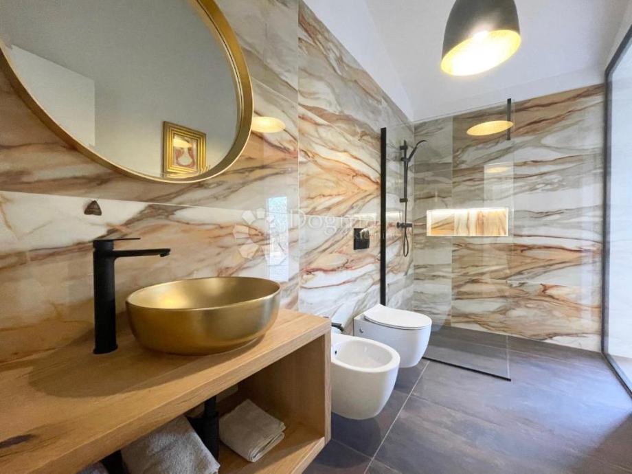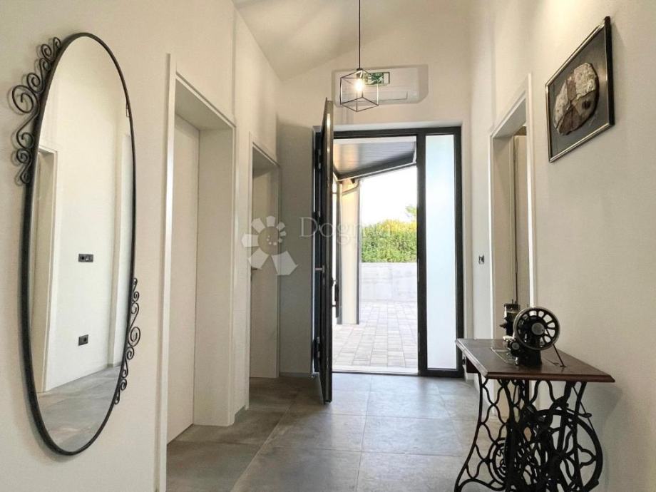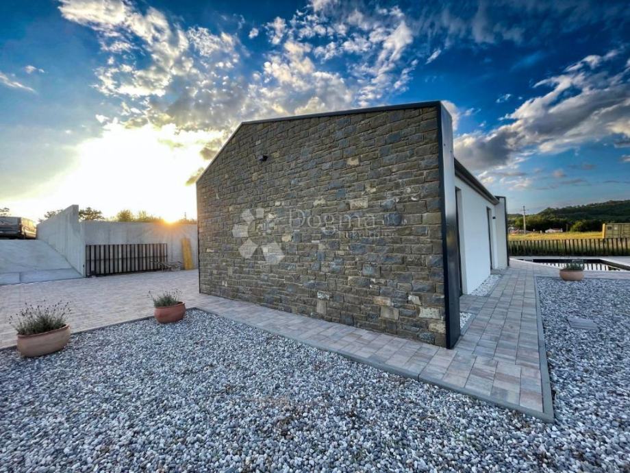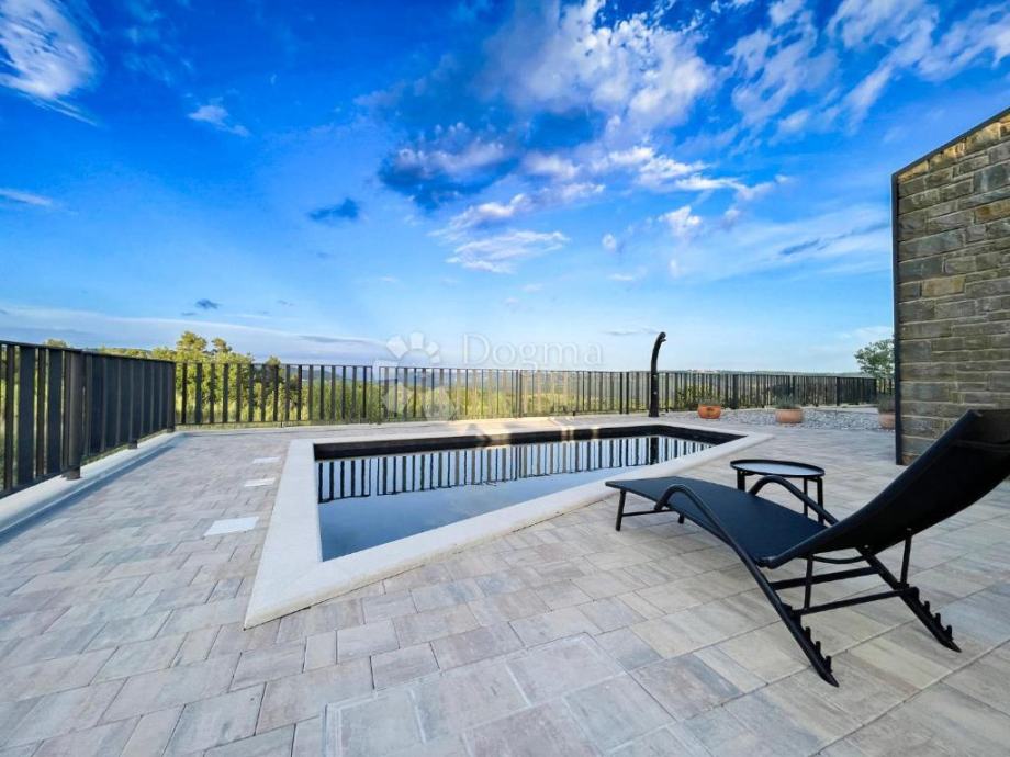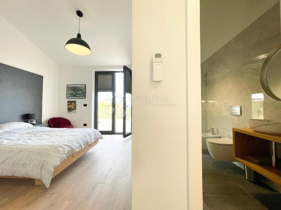 Kuća je izgrađena s vrhunskim materijalima, uključujući istarski tamni kamen i visokokvalitetnu stolariju koji daju autentičan i luksuzan dodir modernom dizajnu kuće, dok visoki stropovi daju osjećaj prostranosti i dodatne svjetlosti u unutarnjim prostorima. Etažno podno grijanje i klima uređaji u svakoj prostoriji osiguravaju ugodnu temperaturu tijekom cijele godine.