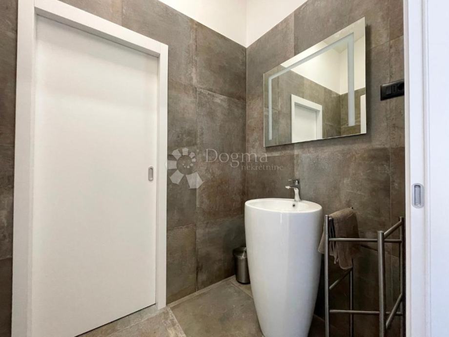 Vanjski prostor uključuje terasu s bazenom i sunčalištem, savršenim za ljetne mjesece i druženja na otvorenom.