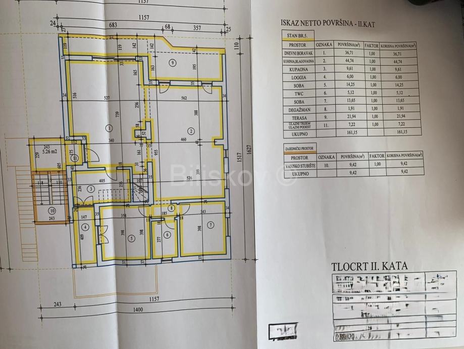 Prostrani dvoetažni peterosoban stan površine 296,39 m2 smjestio se na 2. katu i potkrovlju zgrade sagrađene 2000. godine.