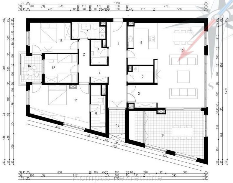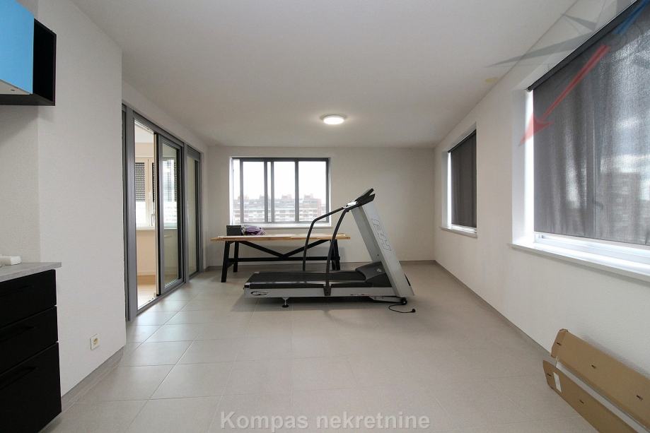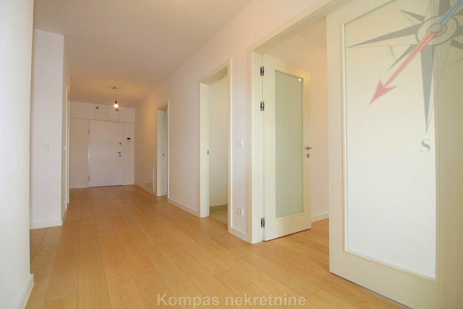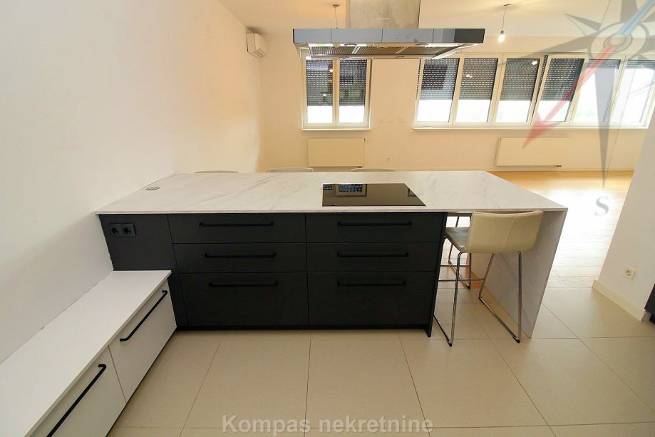 Djelomično namješten 5-soban stan ( 188 m2 ) na osmom katu novije stambeno poslovne zgrade s dva lifta, Ulica Julija Knifera ( Meandar ). Sastoji se od dva hodnika, dvije kuhinje, pet soba, tri kupaonice, dvije loggie.
