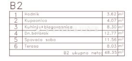 Apartman se sastoji od spavaće sobe, dnevnog boravka s kuhinjom, kupaonice te balkona. Opremljen je klima uređajima i podnim grijanjem u kupaonici, a uz njega dolazi i jedno parkirno mjesto.