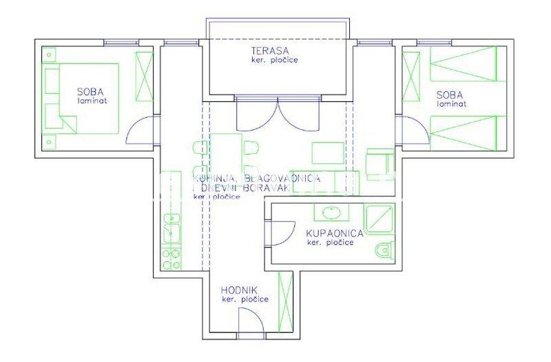 Sastoji se od hodnika, kupaonice, dvije spavaće sobe, kuhinje, dnevnog boravka i terase. Novije je gradnje te posjeduje vlastito parkirno mjesto koje se vidi s prozora i terase.