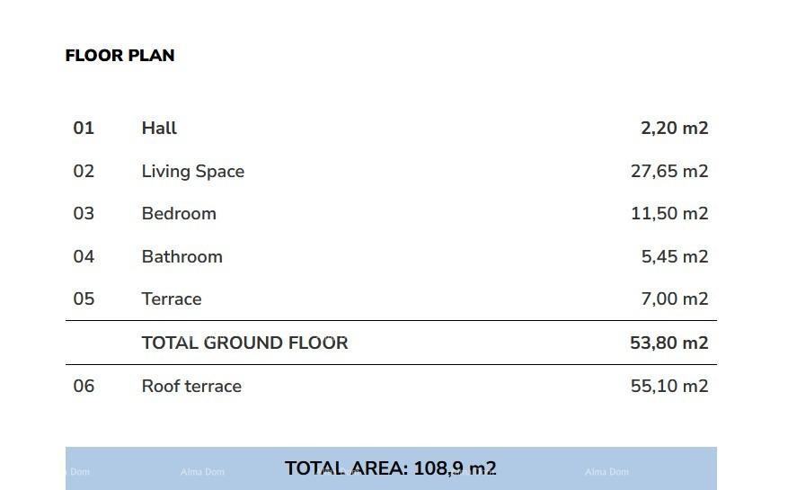 Stan se sastoji od hodnika, spavaće sobe, kupaone, prostranog dnevnog boravka sa kuhinjom i blagvaonom, terase i velike krovne terase od 55.10 m2.