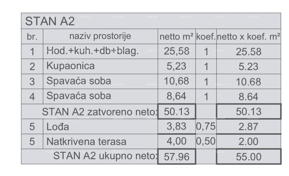 Stan A2, površine 57.96 m2 (neto površine 55 m2) se nalazi na 1.katu stambene zgrade A i sastoji se od ulaznog hodnika, dnevnog boravka, blagovaone i kuhinje, 2 spavaće sobe, kupaone, loggia-e i natkrivene terase.