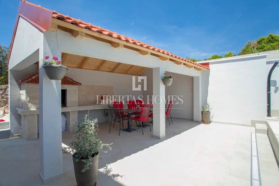 Natkrivena vanjska kuhinja opremljena modernim roštiljem i stolom za 10 osoba, savršena je za obiteljska okupljanja i večernje druženje. Veliki grijani bazen nalazi se u privatnom dijelu iza kuće te omogućuje uživanje u osvježenju i opuštanju tijekom cijele godine.
