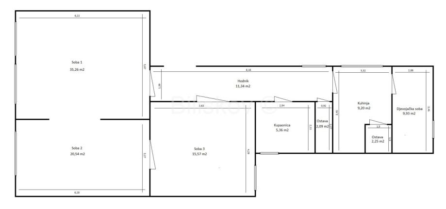 Stan se sastoji od dnevnog boravka, kuhinje, tri spavaće sobe , kupaonice sa WC-om, ostave i hodnika. Stanu neodvojivo pripada spremište na tavanu od 20m2 i u podrumu od 6m2. Visina stropova je 4m.
