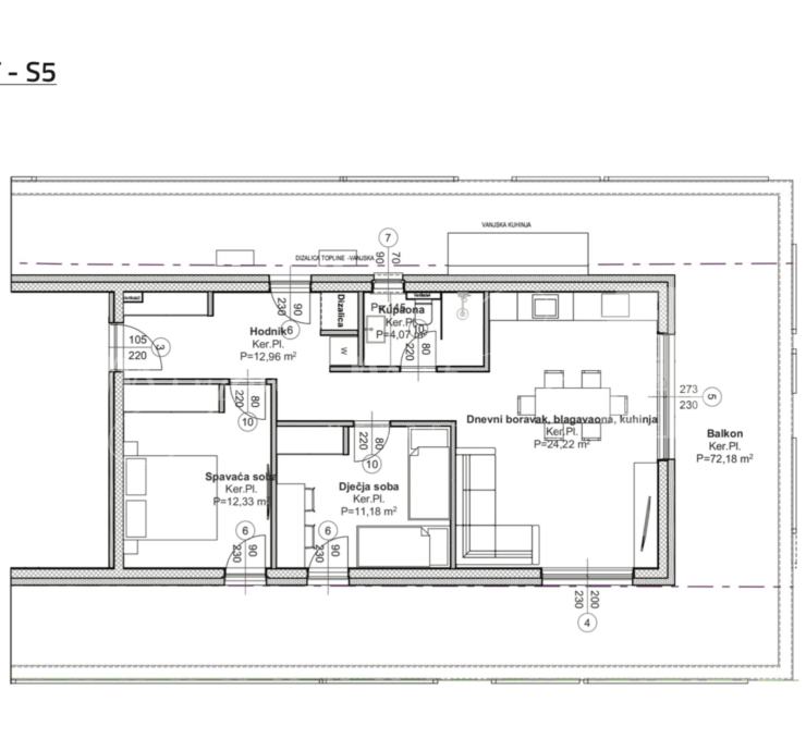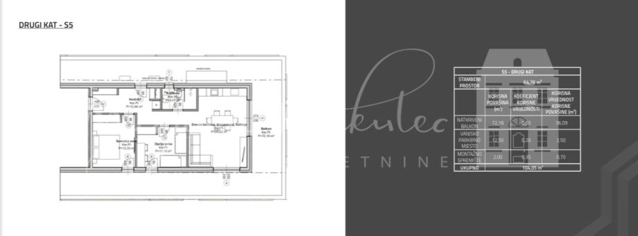 Stan oznake S5 nalazi se na drugom katu. Sveukupna kvadratura iznosi 104.05 m2 dok unutarnjeg stambenog prostora ima 64.76 m2 i čine ga: ulazni hodnik ( 12.89 m2), prostrani dnevni prostor ( dnevni boravak, blagovaona i kuhinja od 24.22 m2), kupaona ( 4 m2) te dvije spavaće sobe od kojih je jedna master soba ( 12.33 m2) i jedna dječja soba ( 11.18 m2). Stanu okružuje veliki natkriveni balkon ( 72.18 m2), savršen za druženje sa obitelji i prijateljima uz roštilj ( vanjska kuhinja) i sa lijepim pogledom na grad.