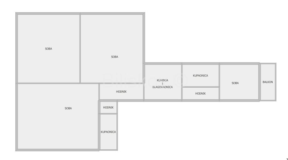 Stan se sastoji od ulaznog hodnika, 3 velike sobe, djevojačke sobe, kuhinje s blagovaonicom, 2 kupaonice s WC-om, ostave i balkona.
