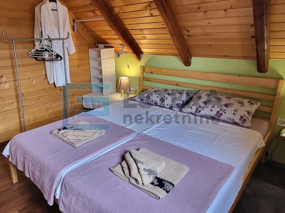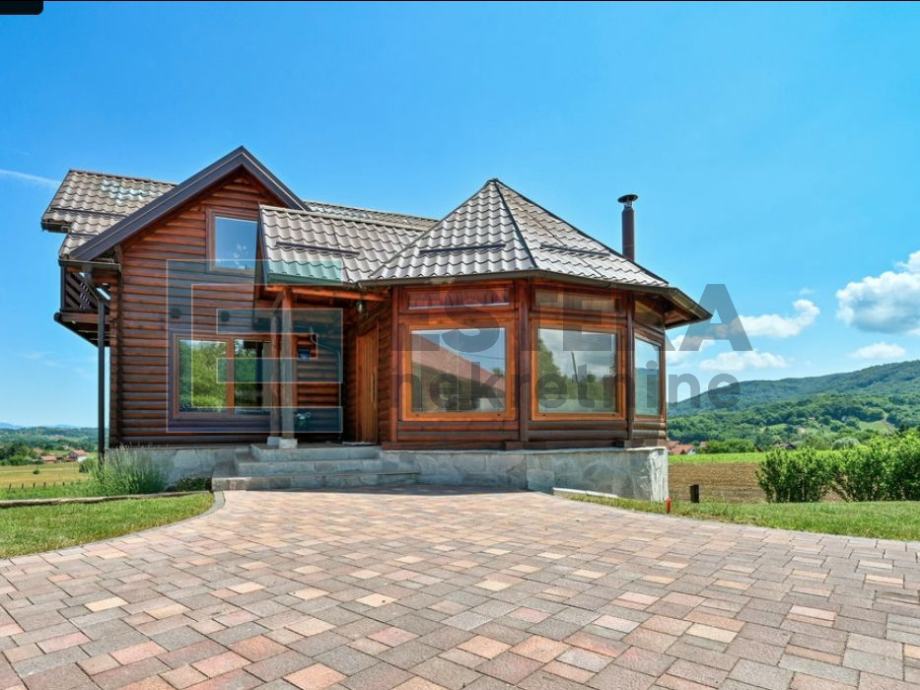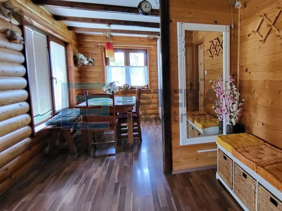 Na prodaju je drvena montažna kuća s bazenom i plantažom sibirskih borovnica. Kuća je izgrađena 2008./2009. godine na armirano-betonskim temeljima i ima tlocrt površine 110 m².
