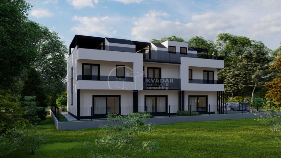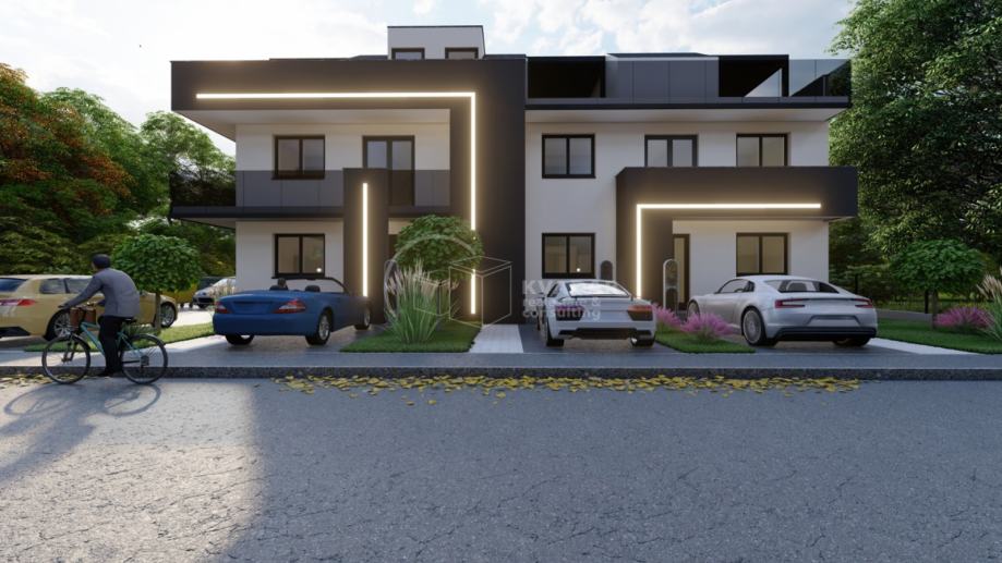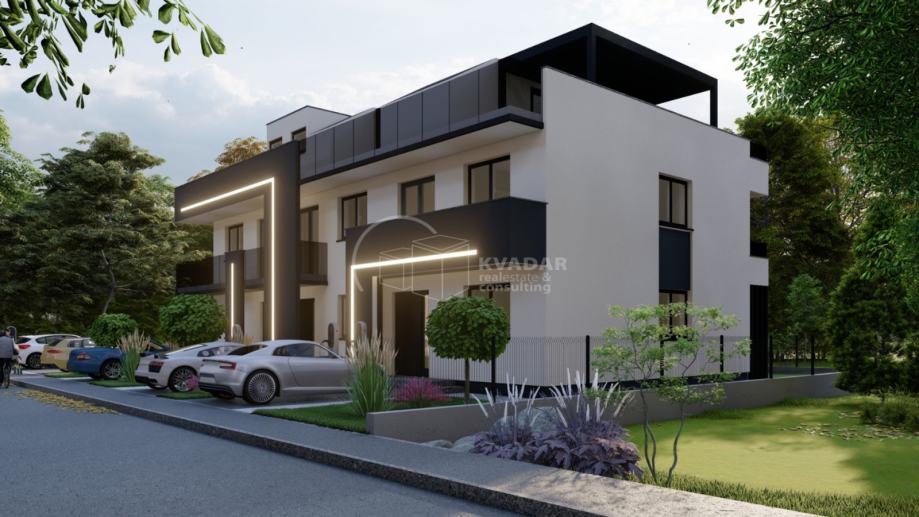 Moderni projekt sa tri kuće u nizu sa pripadajućim parkirnim mjestima i vlastitim vrtovima za maksimalnu udobnost u vlastitom domu. Svaka kuća ima tri etaže: prizemlje, 1.kat i krovnu terasu.