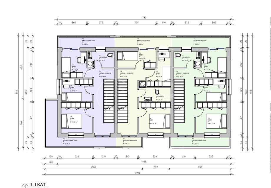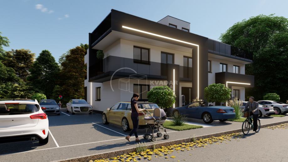 Moderni projekt sa tri kuće u nizu sa pripadajućim parkirnim mjestima i vlastitim vrtovima za maksimalnu udobnost u vlastitom domu. Svaka kuća ima tri etaže: prizemlje, 1.kat i krovnu terasu.