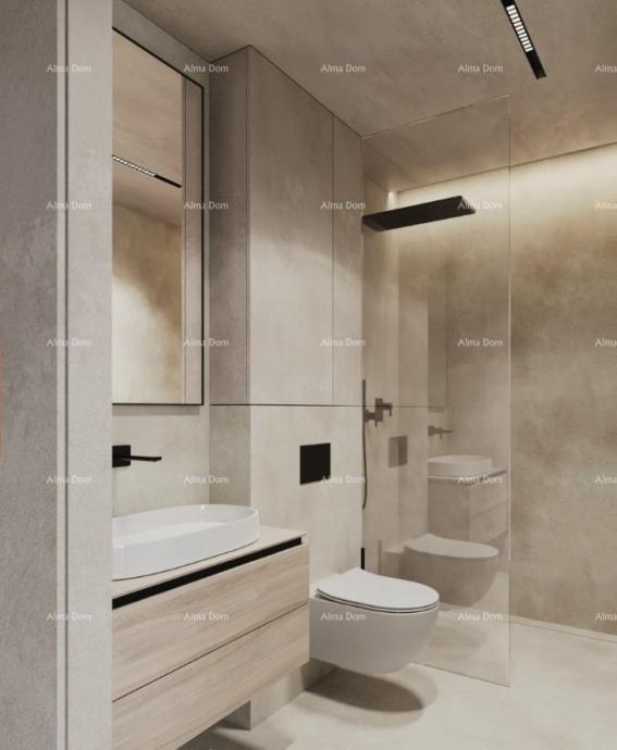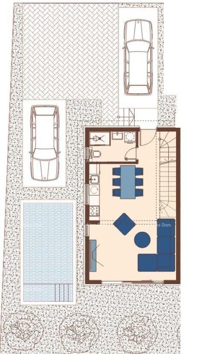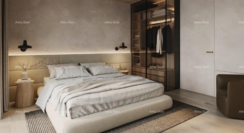 Pizemlje se sastoji od ulaza, gostinjskom toaleta i prostranog dnevnog boravka s kuhinjom i blagavaonom. Iz denvnog boravka se izlazi na terasu i dvorište gdje se nalazi privatni bazen s sunčalištem prostorom za odmor i relaksaciju. stepenice vode na prvi kat gdje se nalaze 2 spavaće sobe s vlastitim kupaonoma i balkon. Drugi kat uključuje hodnik, spavaću sobu s kupaonom i veliku terasu na kojoj se nalazi jacuzzi.