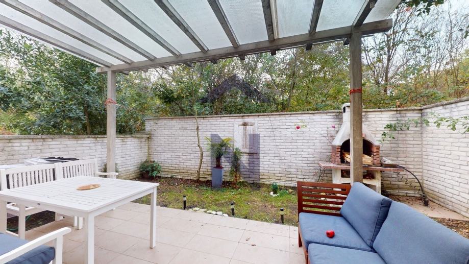 The house includes one parking space of 12.50 sqm and a garage with storage room of 17.14 sqm. In the garden, there is a barbecue area and a pergola.
