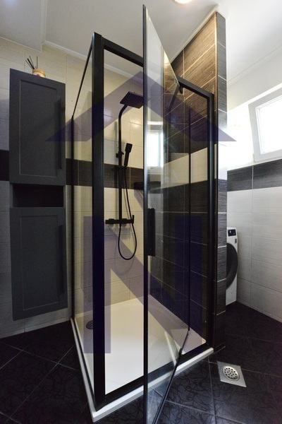 Die Böden im ersten Stock sind mit Parkett-Keramik ausgelegt, im Obergeschoss sind sie mit Laminat und die Wände mit Knauf-Paneelen verkleidet.