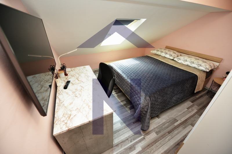 The interior staircase leads to the second floor of the apartment (attic) which consists of: a lobby, two bedrooms with standard double beds, wardrobe cabinets, smart-tv and two auxiliary rooms which are closed, and by opening them one large room can be obtained.