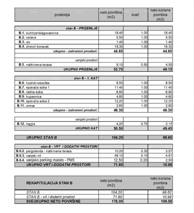 Vanjski prostori se sastoje od: natkrivene terase, terase sa pergotendom i vrta od 49.10 m2 (neto 4.91 m2)