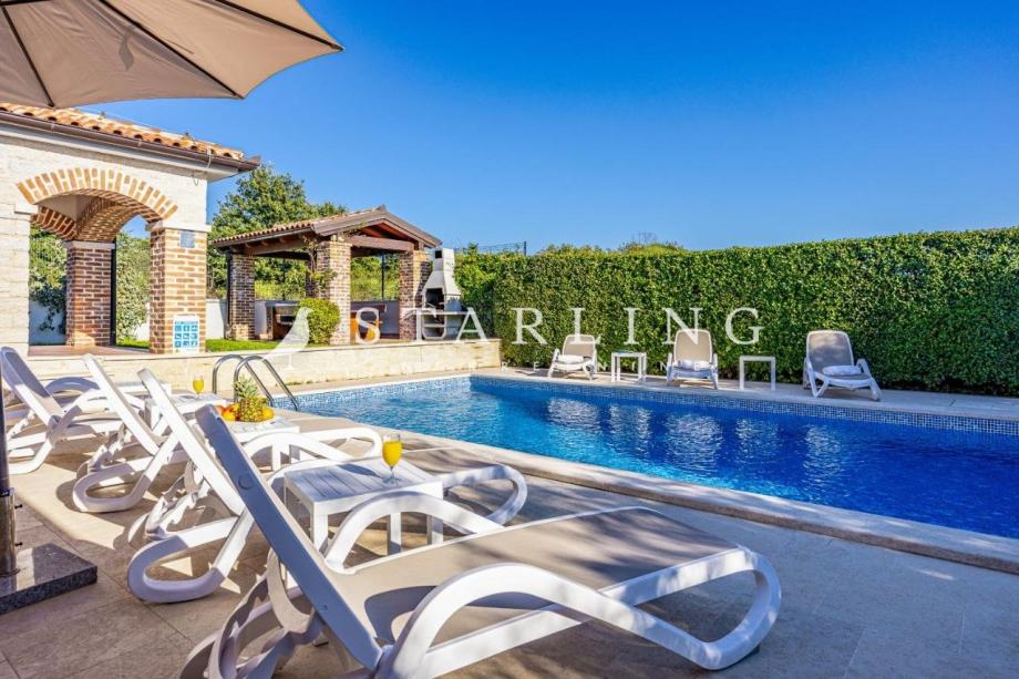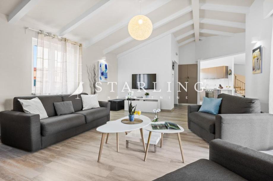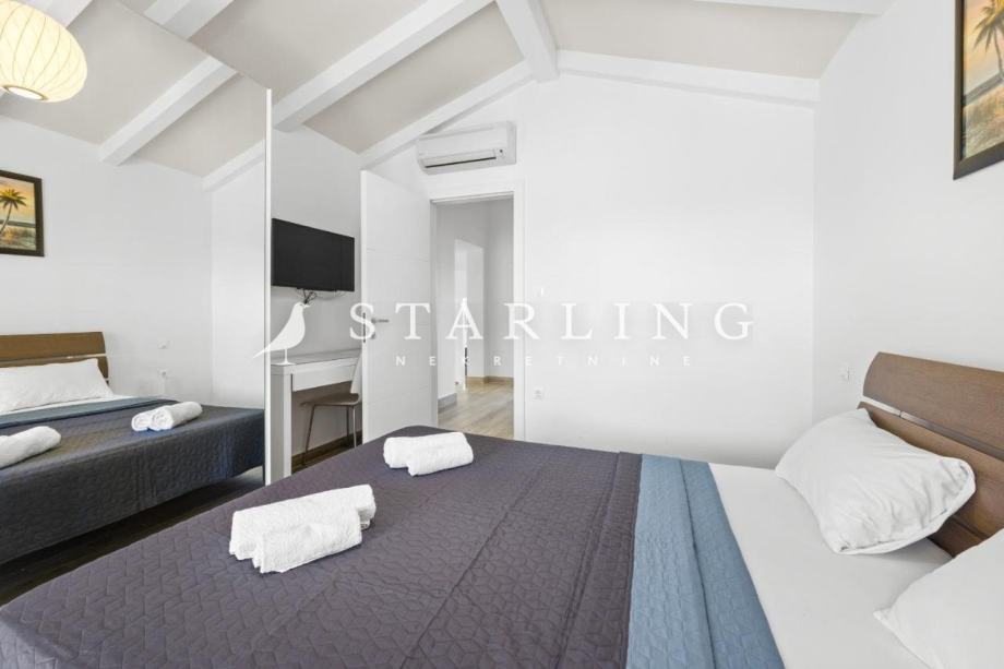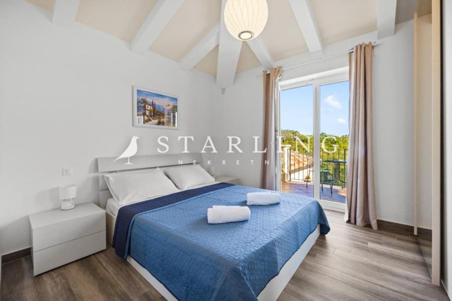 Na katu se nalaze dvije spavaće sobe svaka sa svojom kupaonicom i wc-om, hodnik i terasa korisne površine 43 m2. U okolišu kuće nalazi se parkiralište , opločena terasa, dva kućna vrta, sunčalište i bazen korisne površine 85 m2.