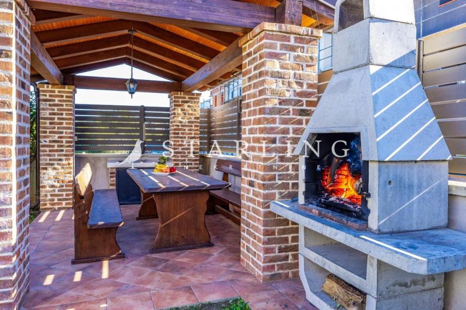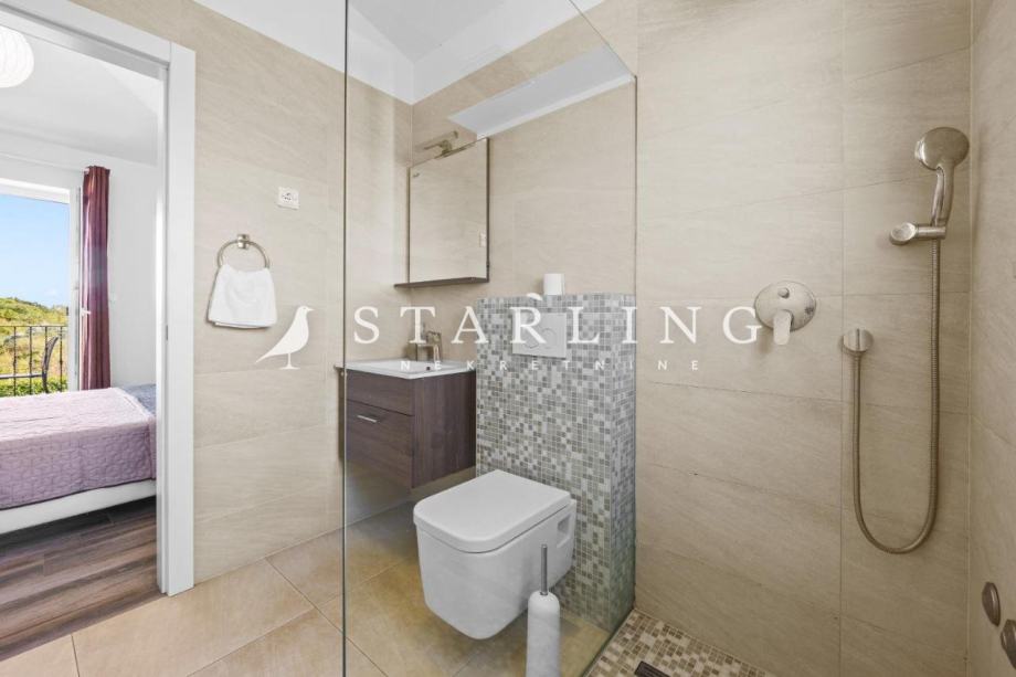 Na katu se nalaze dvije spavaće sobe svaka sa svojom kupaonicom i wc-om, hodnik i terasa korisne površine 43 m2. U okolišu kuće nalazi se parkiralište , opločena terasa, dva kućna vrta, sunčalište i bazen korisne površine 87 m2.