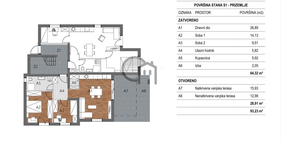 Na prodaju je prostran i funkcionalan dvosoban stan smješten u prizemlju moderne novogradnje, na mirnoj i traženoj lokaciji u šibenskom naselju Vidici. Ova nekretnina nudi idealan spoj udobnog stanovanja i praktične blizine svim važnim sadržajima – u blizini se nalaze trgovine, škole, vrtići, kao i gradski javni prijevoz, dok je centar Šibenika udaljen svega nekoliko minuta.Stan se nalazi u zgradi s ukupno pet stambenih jedinica, koja se gradi prema visokim standardima uz korištenje kvalitetnih materijala i suvremene opreme.Neto korisna površina stana iznosi 93,23 m², a raspored prostorija pažljivo je osmišljen kako bi se omogućio maksimalan komfor. Središnji dio stana čini prostrani open-space dnevni boravak s kuhinjom i blagovaonicom površine 26,89 m², koji se nastavlja na natkrivenu terasu od 15,93 m² i dodatnu nenatkrivenu terasu od 12,98 m² – savršene za boravak na otvorenom, obiteljska druženja ili opuštanje.Stan sadrži dvije spavaće sobe – veću od 14,13 m² i manju od 9,51 m², moderno uređenu kupaonicu (5,92 m²) te praktično spremište (2,05 m²). U cijenu stana uključeno je i označeno parkirno mjesto.Zgrada je opremljena podnim grijanjem u svim prostorijama, klima uređajima te velikim staklenim površinama koje osiguravaju obilje prirodnog svjetla, dok visoka kvaliteta gradnje i završne obrade jamči dugoročnu vrijednost i udobnost.Ova nekretnina predstavlja izvrsnu priliku za obiteljski život, udoban dom za parove, ali i kao pametna investicija za dugoročni najam.Za više informacija i dogovor oko razgleda, slobodno nas kontaktirajte.