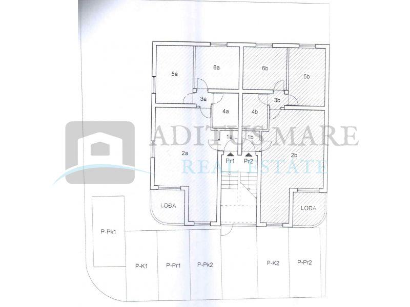 STAN 3 – Prvi kat, lijevi ulaz, pozicija SZ, sastoji se od: hodnika, dnevnog boravka s sa blagovaonicom i kuhinjom, kupaonice, dvije spavaće sobe, podne površine 58,24 m2. Stanu pripada lođa uz stan podne površine 5,29 m2 i parkirno mjesto u tlocrtu prizemlja (P-K 1) površine 11,50 m2.
