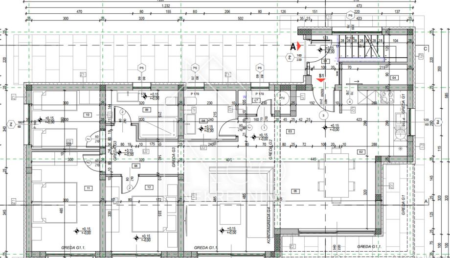 Stan S1 se nalazi u prizemlju te je ukupne korisne površine 123,41 m2. Sastoji se od ulaza, kuhinje i blagovaonice, spremišta, WC-a, kupaonice te tri spavaće sobe.