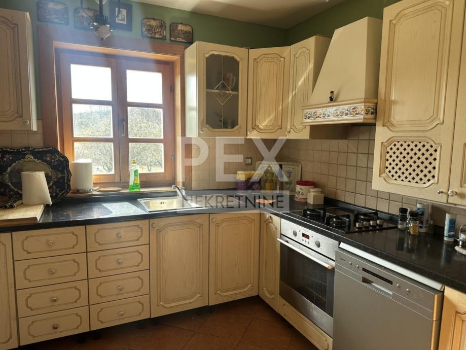 Sa svojih 200 m2 stambene površine koje su raspoređene na tri etaže, a sastoje se od suterena, prizemlja i kata zaista ne nedostaje mjesta ni za koga. Sve etaže su povezane unutrašnjim stubištem. U suterenu se nalazi vinski podrum. Prizemlje kuće se sastoji od dnevnog boravka s izlazom na natkrivenu terasu, blagovaone, kuhinje, dvije spavaće sobe i dvije prostrane kupaone, dok prvi kat nudi još dvije spavaće sobe i kupaonu. Uz kuću se nalazi još jedna natkrivena terasa i mjesto za druženje s pecanom te natkrivena drvena sjenica s arteškim bunarom. U nizu kuće nalazi se još jedna kuća koja se sastoji od jedne spavaće sobe i kupaone te tehničke sobe s odvojenim ulazima. Prodaje se ne namještena.