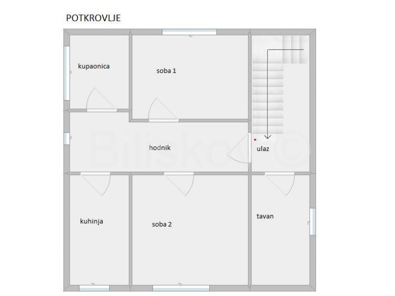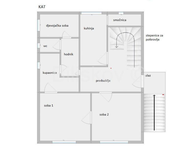 Na katu kuće se nalazi predsoblje, hodnik, dvije sobe, djevojačka soba, kupaonica, wc, kuhinja i ostava.