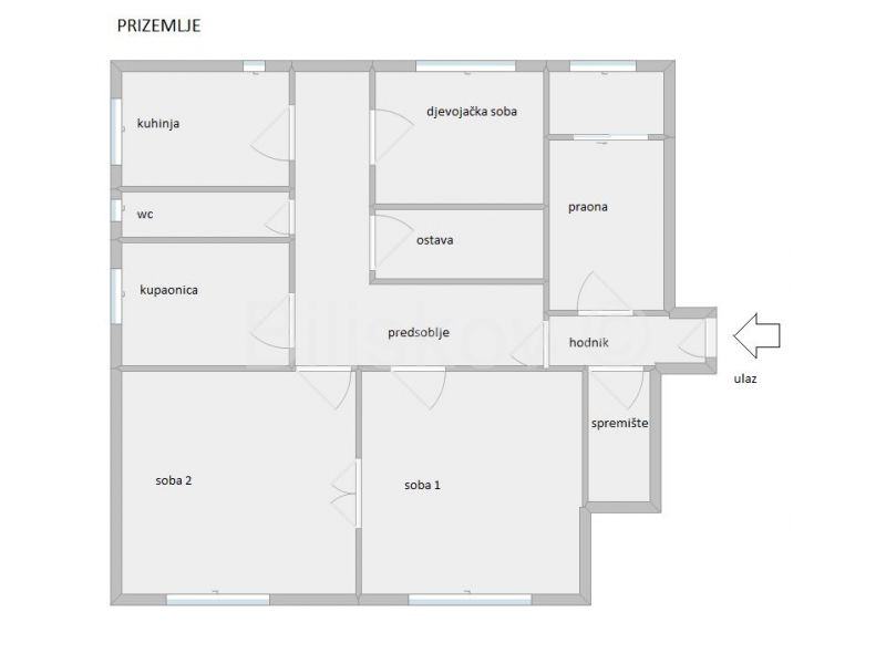 U prizemlju kuće se nalaze hodnik, predsoblje, dvije sobe, djevojačka soba, kupaonica, wc, kuhinja, spremište i ostava.