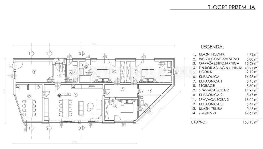 Na prodaju je građevinsko zemljište površine 863 m² s ishođenom i pravomoćnom građevinskom dozvolom za izgradnju samostojeće kuće s bazenom. Projektirana kuća ima ukupnu bruto površinu od 168 m² i sastoji se od prostranog dnevnog boravka s kuhinjom i blagovaonicom, tri spavaće sobe, tri kupaonice, tehničke prostorije, ostave te natkrivene terase. U dvorištu je predviđena izgradnja privatnog bazena.
