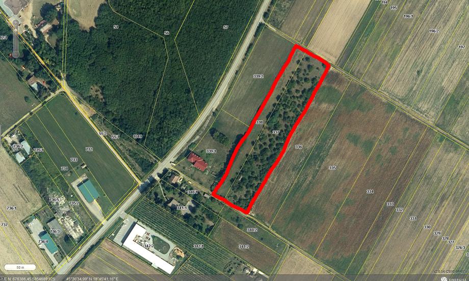 Površina od 16.690 m2, atraktivnog zemljišta uz glavnu cestu prema Vardarcu, odmah pokraj Baranjskih noći. Širina fronte 60m. Oko 7500 m2 je u građevinskoj zoni (prema GUP-u turistička namjena), a drugi dio od oko 1 ha je visoko vrijedno poljoprivredno zemljište - katastarski se vodi kao voćnjak i oranica. Na zemljištu je jedan zidani ucrtani objekt od oko 50 m2 poljoprivredne namjene. Priključak za struju HEP, sva komunalna infrastruktura u blizini. Veći dio zemljišta je ograđen žičanom ogradom. Pristupna cesta sa sjeverne i južne strane. Mogućnost proširenja na prvu susjednu parcelu iste veličine.