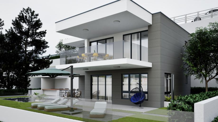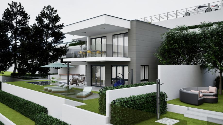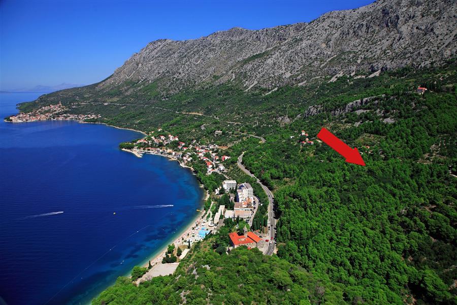 Zemljište je pravilnog oblika površine 2300m2 i prostire se na blagoj padini te ima otvoren panoramski pogled na more koji se ne može ni u budućnosti zakloniti. Zemljište ima pristupni put i svu infrastrukturu . Udaljenost do plaže je 500 m zračne linije.