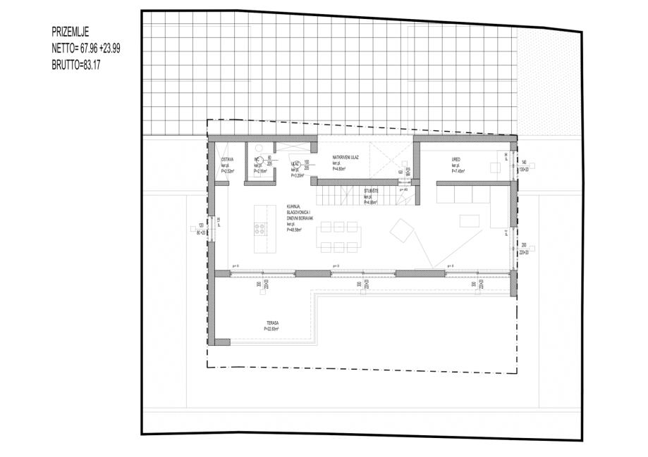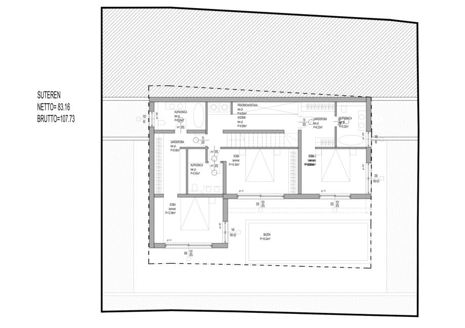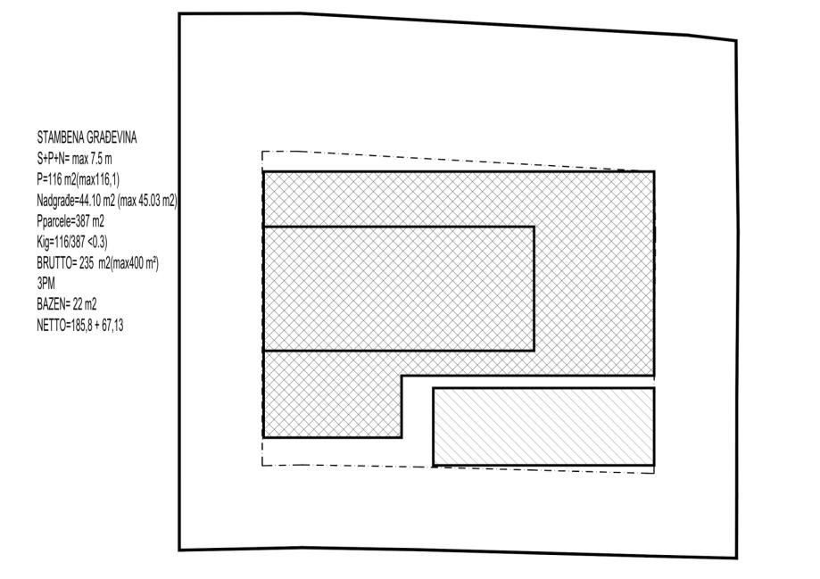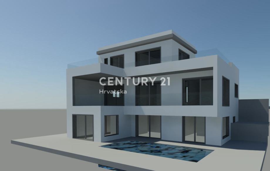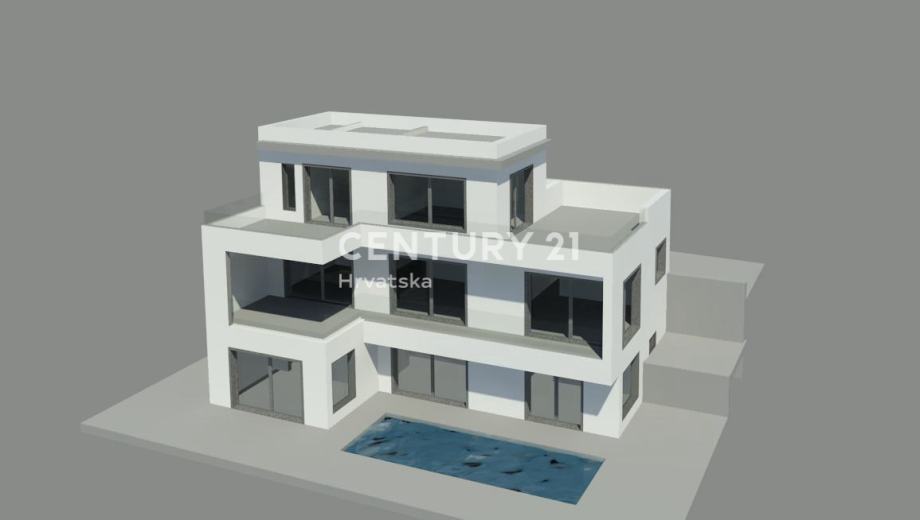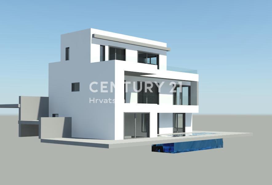 Na prodaju građevinsko zemljište s ishodovanom građevinskom dozvolom za izgradnju moderne vile s bazenom. Vila je projektirana kao luksuzni objekt s tri etaže – suteren, prizemlje i nadgrađe – s otvorenim pogledom na more i prostranom okućnicom.