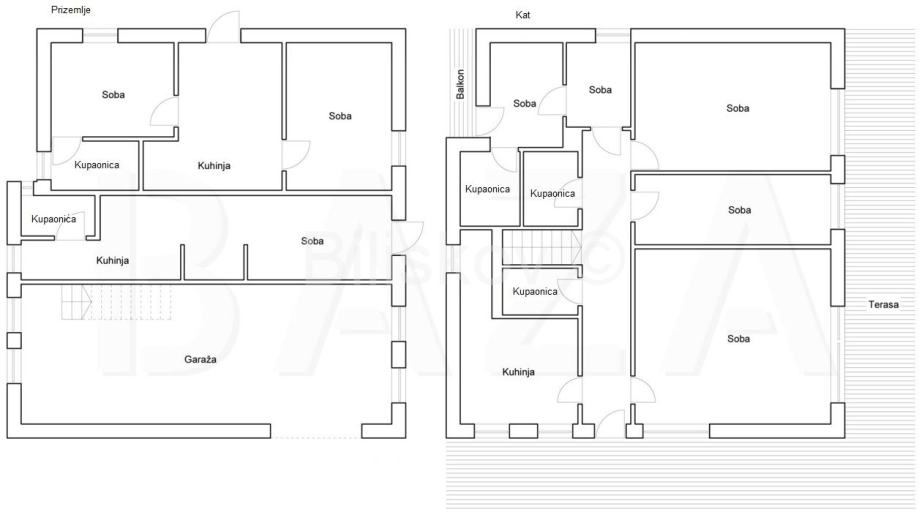 Na katu se nalazi peterosoban stan (pet soba, tri kupaone, kuhinja, balkon i terasa).