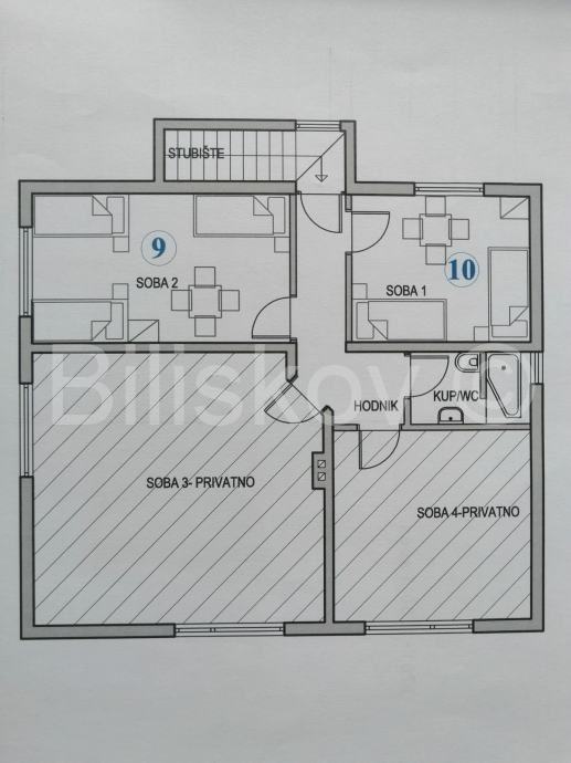 Kuća se sastoji od 2 nadzemne etaže. Prizemlje se sastoji od 2 ulazna hodnika, 6 soba, dnevnog boravka, kuhinje s blagovaonom te kupaonice s wc-om i dodatne prostorije s wc-om. Na katu se nalaze još 4 sobe te kupaona s wc-om. Kuća je adaptirana 2018. godine i dodana su još dvije kupaone.
