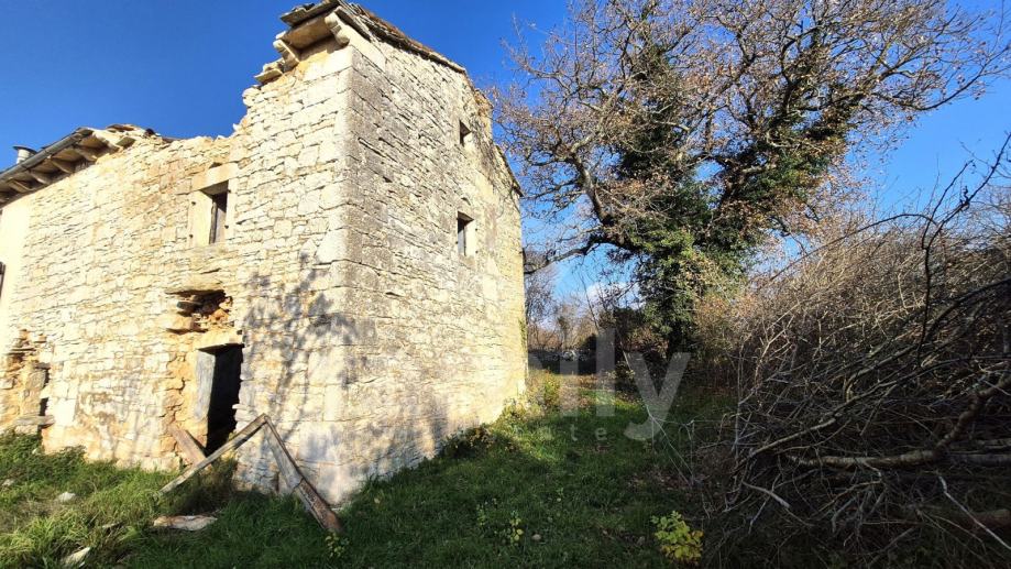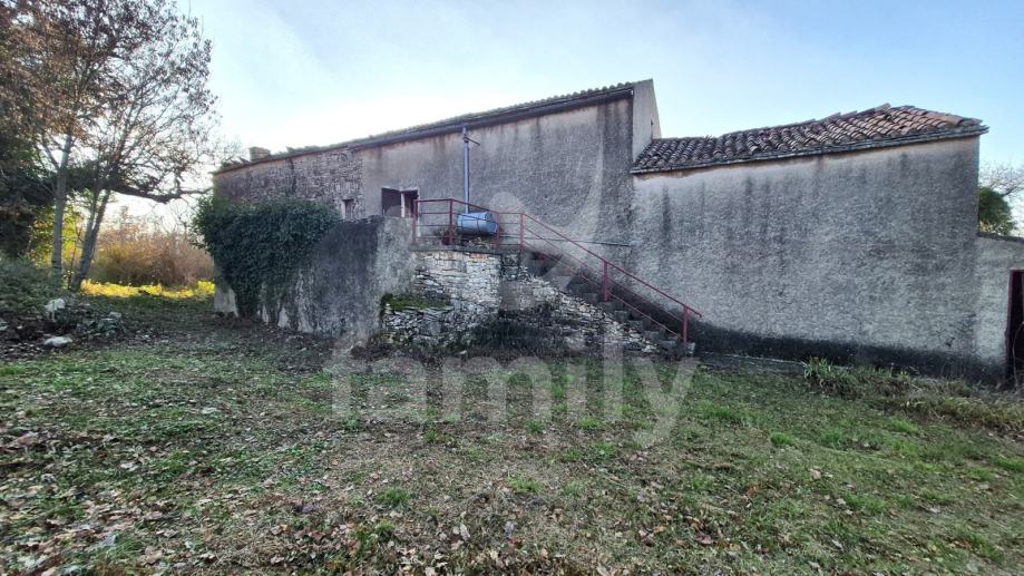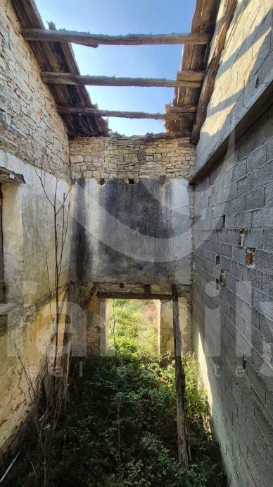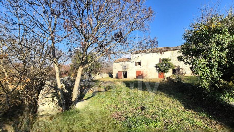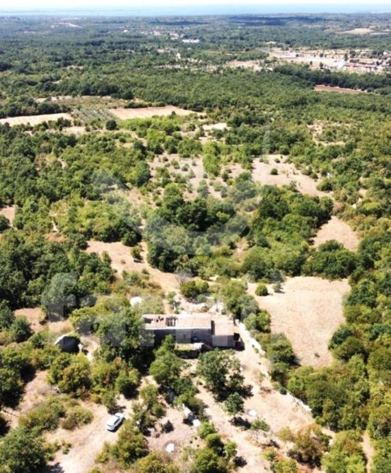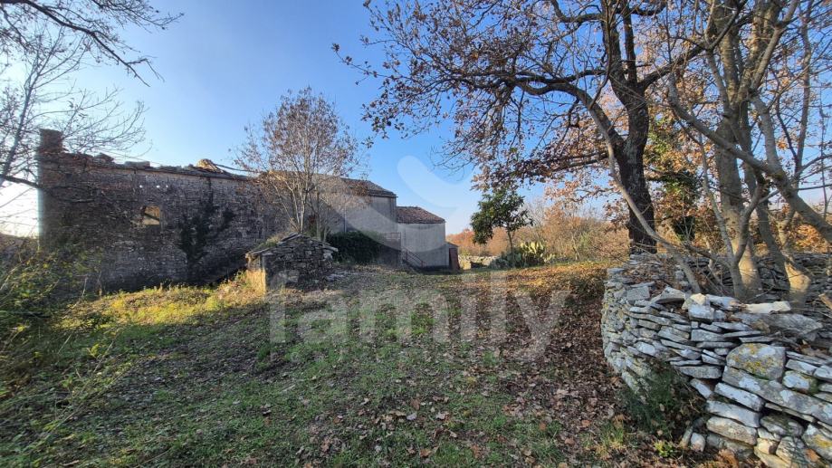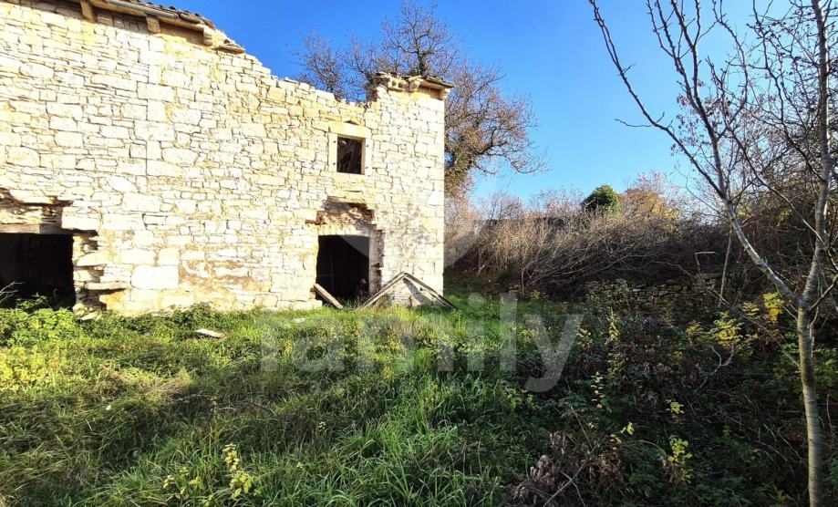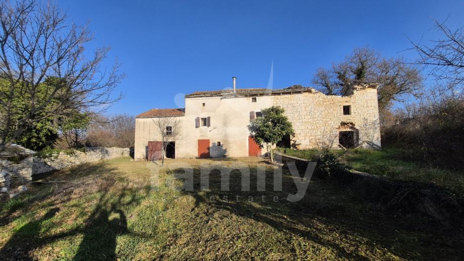 Na prodaju je dvojna kuća za renovaciju smještena na iznimno prostranom zemljištu, na lokaciji koja pruža potpunu privatnost, tišinu i pogled na šumu imanje sveukupne površine 36 074 m2. Nekretnina se nalazi svega 30 tak metara od asfaltirane ceste, s osiguranim pristupnim putem, a istovremeno je dovoljno udaljena od svakodnevnih gužvi. Na zemljištu ima niskih stabala hrasta, ostalo je pašnjak i vinograd. Zemljište je raznoliko i vrlo atraktivno: jedan dio je ograđen tradicionalnim suhozidom, dio je potpuno ravan i idealan za vrt, bazen ili rekreacijski prostor, dok cijelo zemljište odiše autentičnim istarskim karakterom i prirodnim okruženjem. Na samom zemljištu nalazi se dvojna kamena kuća kojoj je sveukupna površina oko 435 m2 raspoređeno na prizemlje, kat i potkrovlje. Kuća raspolaže s visokim potencijalom za uređenje za stanovanje ili u ugostiteljske svrhe. Na katu se trenutno nalaze soba, kuhinja i manji dnevni prostor s grijanjem na drva, dok je kupaonica odvojena. Drugi dio objekta ima zaseban ulaz i danas služi kao garažni prostor i spremište, s mogućnošću prenamjene u dodatne stambene ili turističke sadržaje. Druga polovica kuće je skroz u kamenu s tim da je porušena. Ispred kuće nalazi se urbanizirani dio zemljišta pogodan za gradnju dodatnih objekata na svega 3602 m2. Zemljište je pozicionirano sa blagim nagibom tako da posjeduje otvoreni pogled, a sa prizemlja se djelomično vidi i more. Okvirno 20 metara udaljeno od kuće nalazi se drugi objekt koji je djelomično postojan u kamenu koji je korišten kao štala sveukupne površine 90 m2. Ispred nekretnina posjedujemo i kažun sveukupne površine okvirno 10 m2 . Zbog velikog broja suhozida postoji velika količina kamenja za ograditi česticu. Do objekta se nalazi i cisterna za vodu. Jedn od dva objekta posjeduje uporabnu dozvolu.