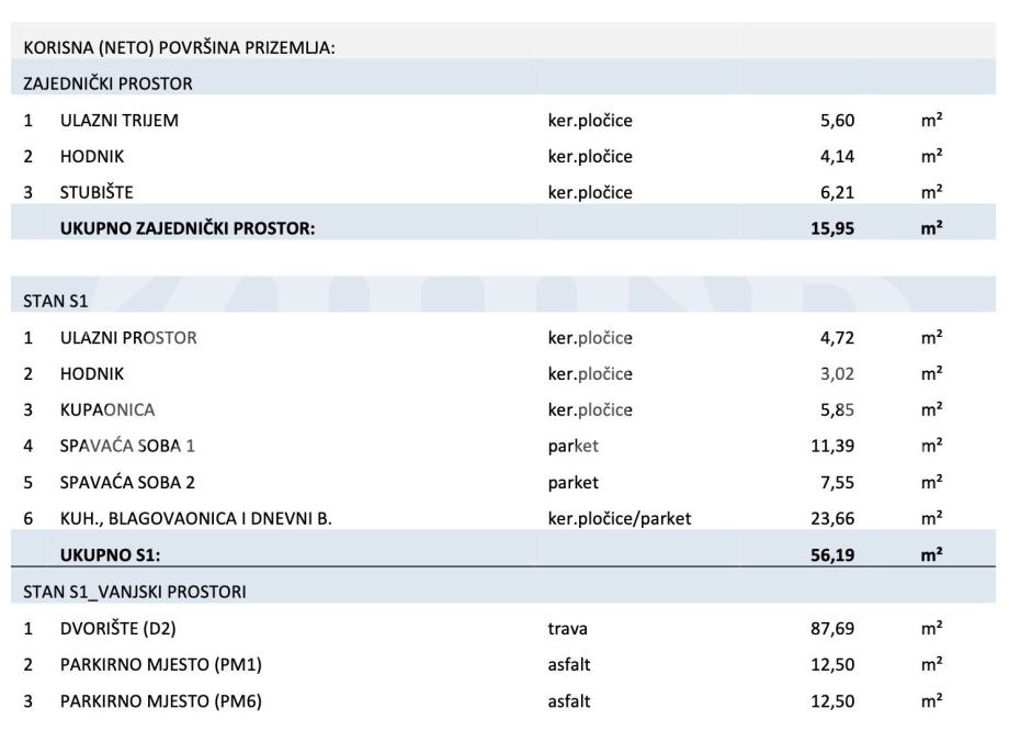 S1 - Dnevni boravak s kuhinjom i blagavaonicom, dvije spavaće sobe, kupaonica, ukupne površine 56,52 m2 + vrt 88 m2 + 2 parkirna mjesta = 199.388 eura