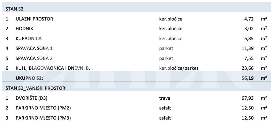 S2 - Dnevni boravak s kuhinjom i blagavaonicom, dvije spavaće sobe, kupaonica, ukupne površine 56,52 m2 + vrt 68 m2 + 2 parkirna mjesta = 193.844 eura