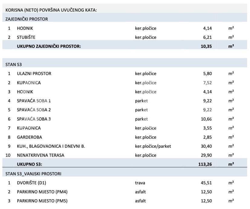 S3 - Dnevni boravak s kuhinjom i blagavaonicom, master spavaća soba s kupaonicom i garderobom, još dvije spavaće sobe, druga kupaonica, ukupne površine 83 m2 + terasa 30 m2 + vrt 45 m2 + 2 parkirna mjesta = 252.590 eura