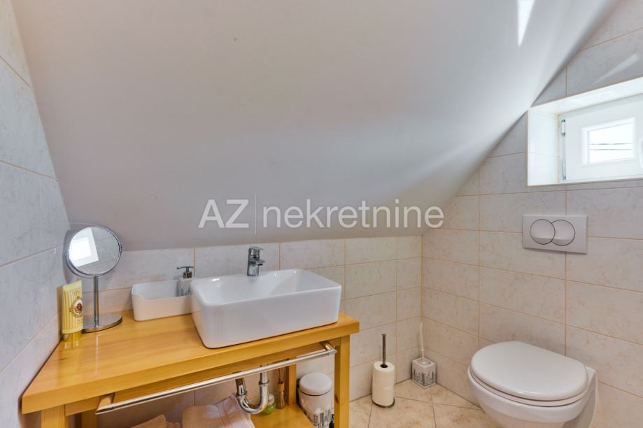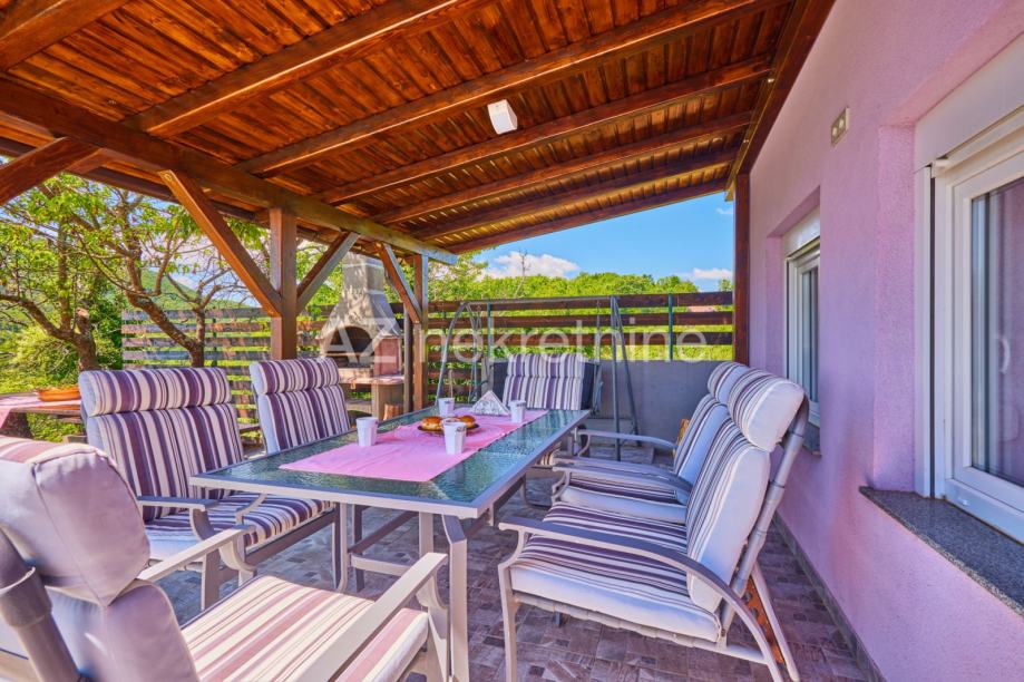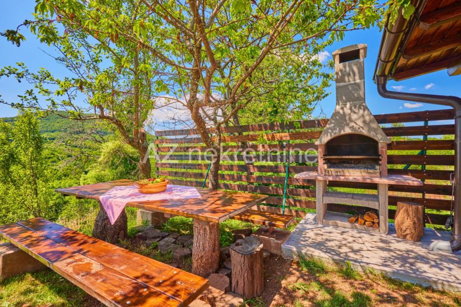 U prizemlju je smještena kuhinja , blagovaonica/dnevni boravak i kupaonica, a ispred kuće se nalazi natkrivena i popločena terasa (20m2) s roštiljem orijentirana prema jugu s divnim pogledom na zelenilo.