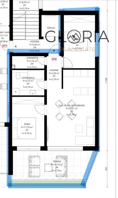 - Dnevni boravak s kuhinjom i blagovaonicom – 23,51 m2