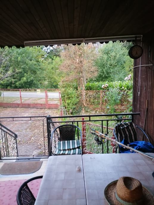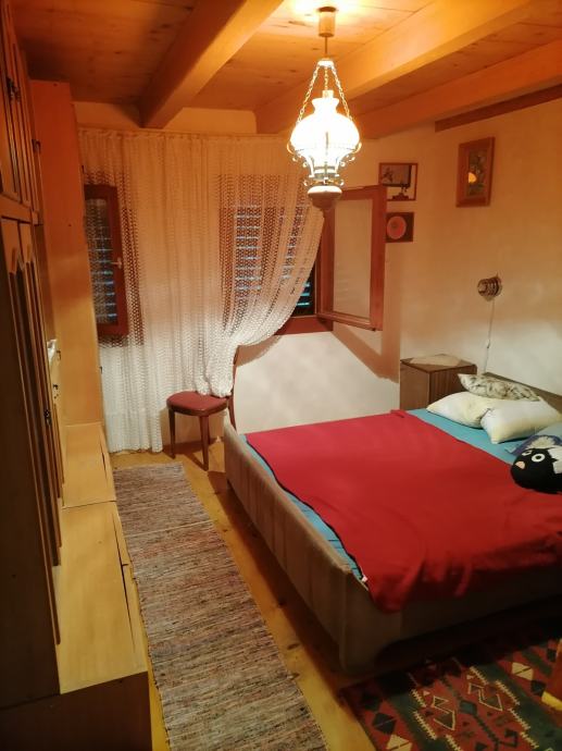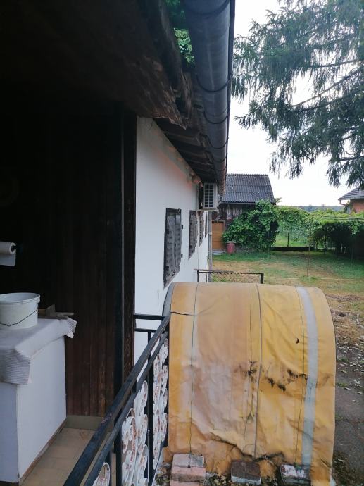 Ova ruralna zdrava kuća stoji na betonskoj deki visine oko 90 cm od okolnog terena-dvorišta, montirana od hrastove građe i dvostrešni krov kuće. WC i kupaona su od opeke, betona s pločicama i sve sanitarije. Kuća je visoko prizemlje s terasom, WC i kupaonica uk. oko 95 m2. Podrum oko 35 m2. svi podovi su od ariša-brodski pod 24 mm premazan bezbojnim lakom. Vlage nema niti u tragovima. Garaža, drvarnica i radionica - bivša štala na betonskoj deki. Uređeno i namješteno sve , kao na fotografijama. Vodovod vani i u kući a izgrađena nova dvodijelna septička jama oko 16 m od građevine. Struja , gradski vodovod, telefon i kanalizacija interna-septičkas jama s drenažom u livadi.