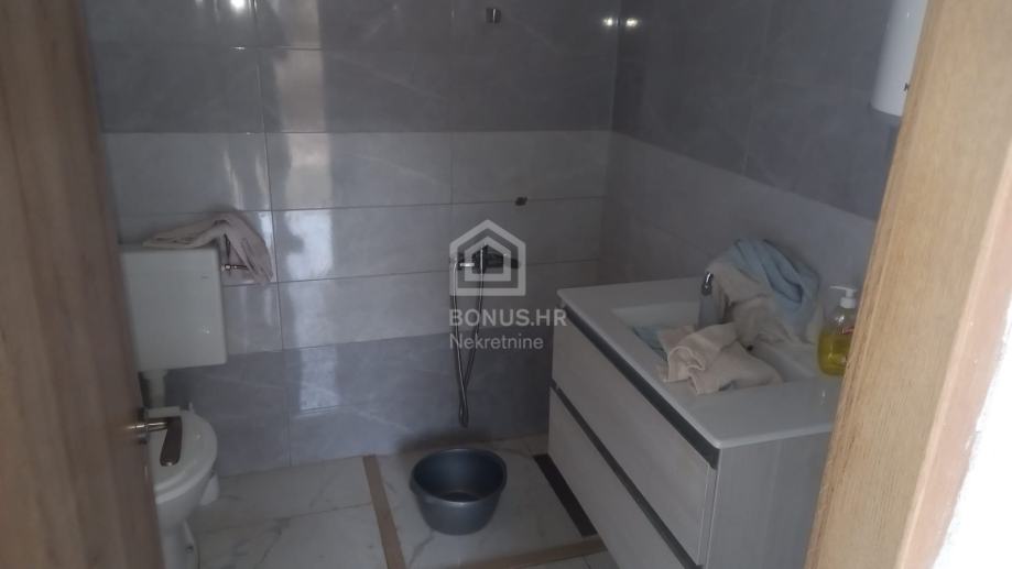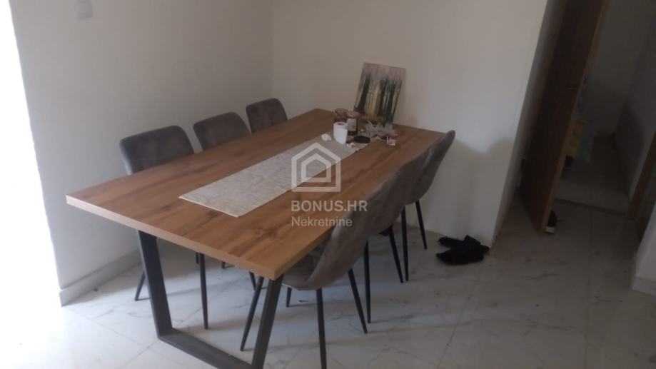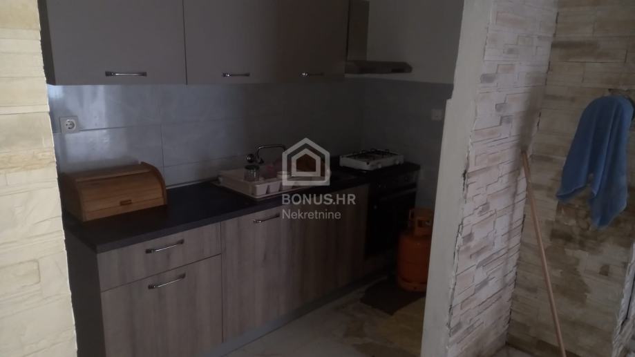 Kuća ukupne površine 108m2 sastoji se od dnevnog boravka, kuhinje s blagovaonicom, 2 spavaće sobe (jedna nije namještena) i kupaonice.